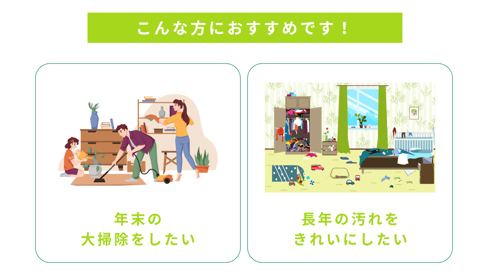 - 清掃箇所周辺の小物や日用品は、できる範囲で事前に片付けていただけるとスムーズに作業が進みます。